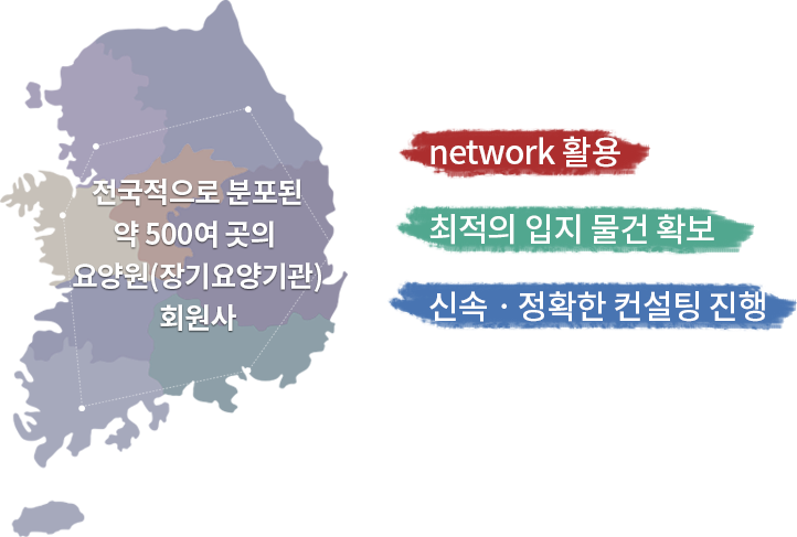 사회복지 전문 행정사는 전국적으로 분포된 요양원(장기요양기관) 회원사(실버케어존을 비롯한 여러 파트너사의 수임 기관 : 약 500여 곳)의 네트워크를 활용해서, 의뢰인이 원하는 최적 입지의 물건을 확보하여 신속ㆍ정확하게 양도양수 컨설팅을 제공해드립니다.(공인중개사, 법무사 등 다수의 전문가 및 부동산컨설팅 회사와 협업하여 컨설팅 수행)