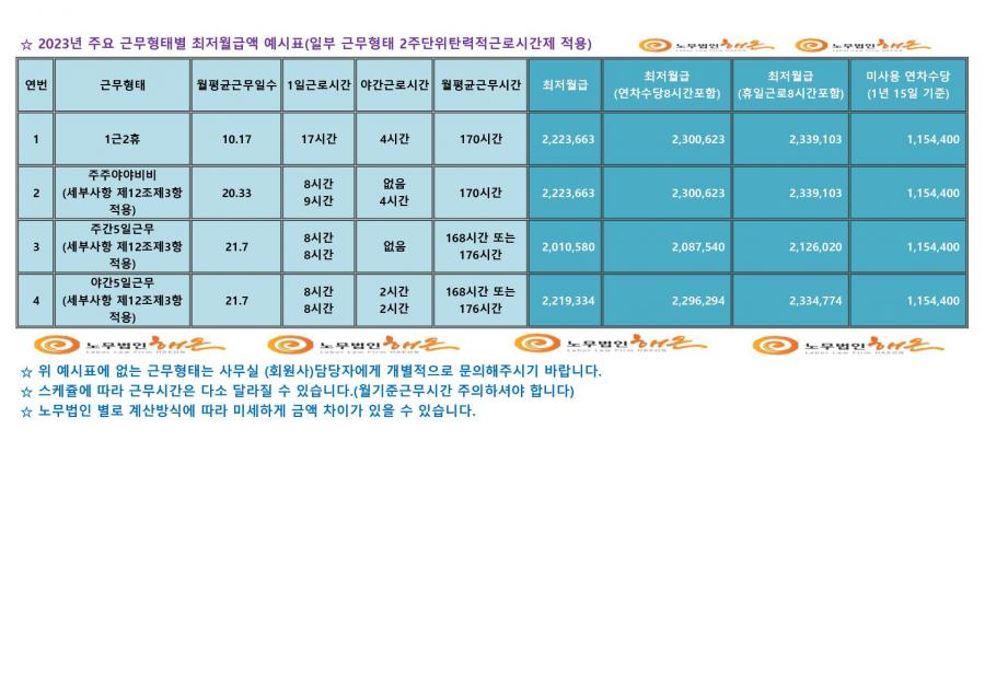 2023년 주요 근무 형태별 최저월급액 예시표 배포