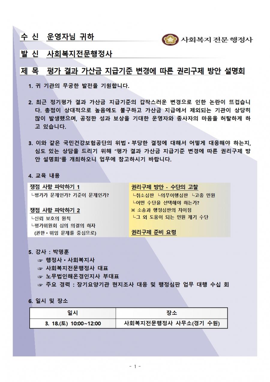 정기평가 결과 가산금 지급기준 변경에 따른 권리구제 방안 설명회 개최 안내