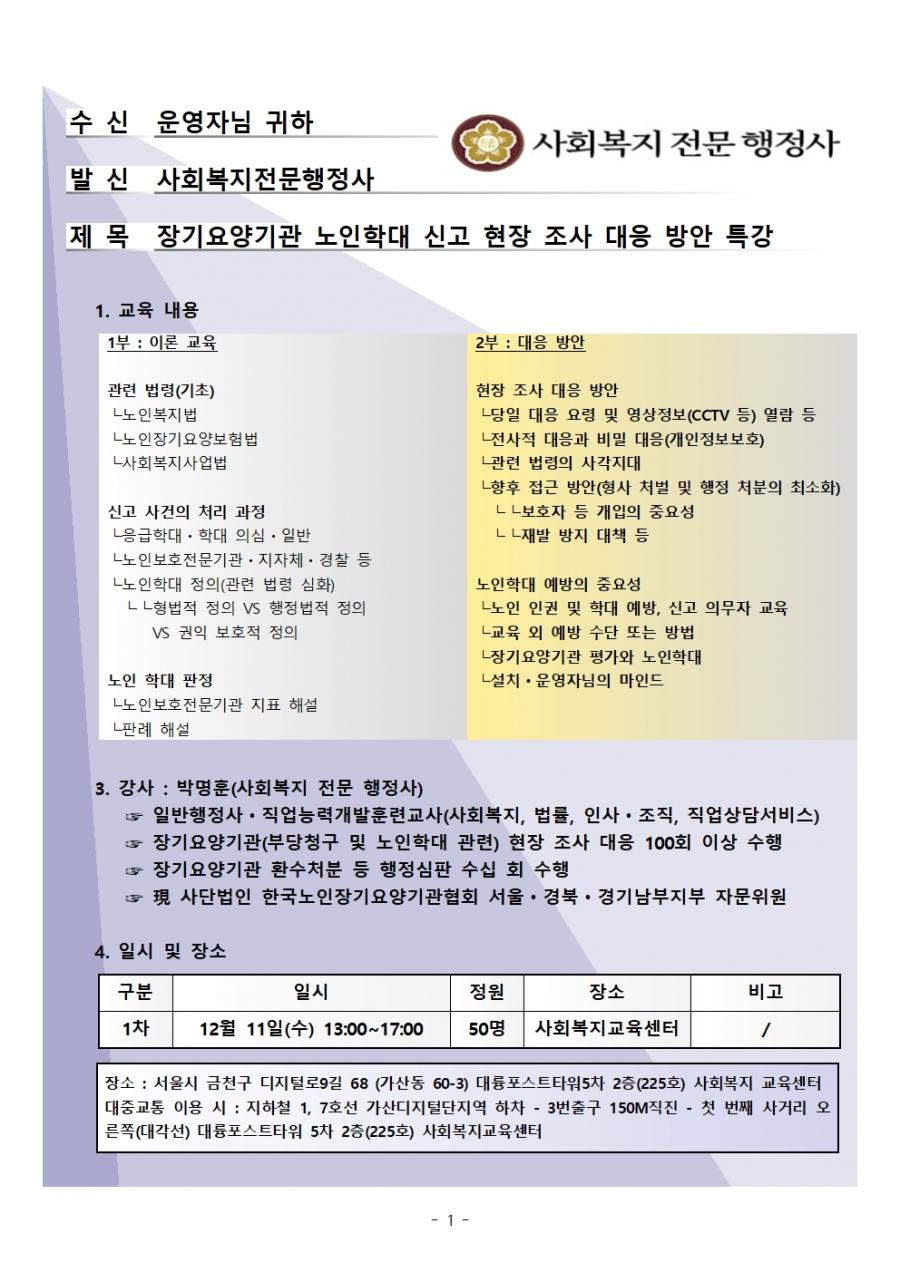 장기요양기관 노인학대 신고 현장 조사 대응 방안 특강
