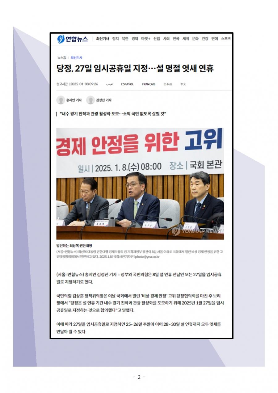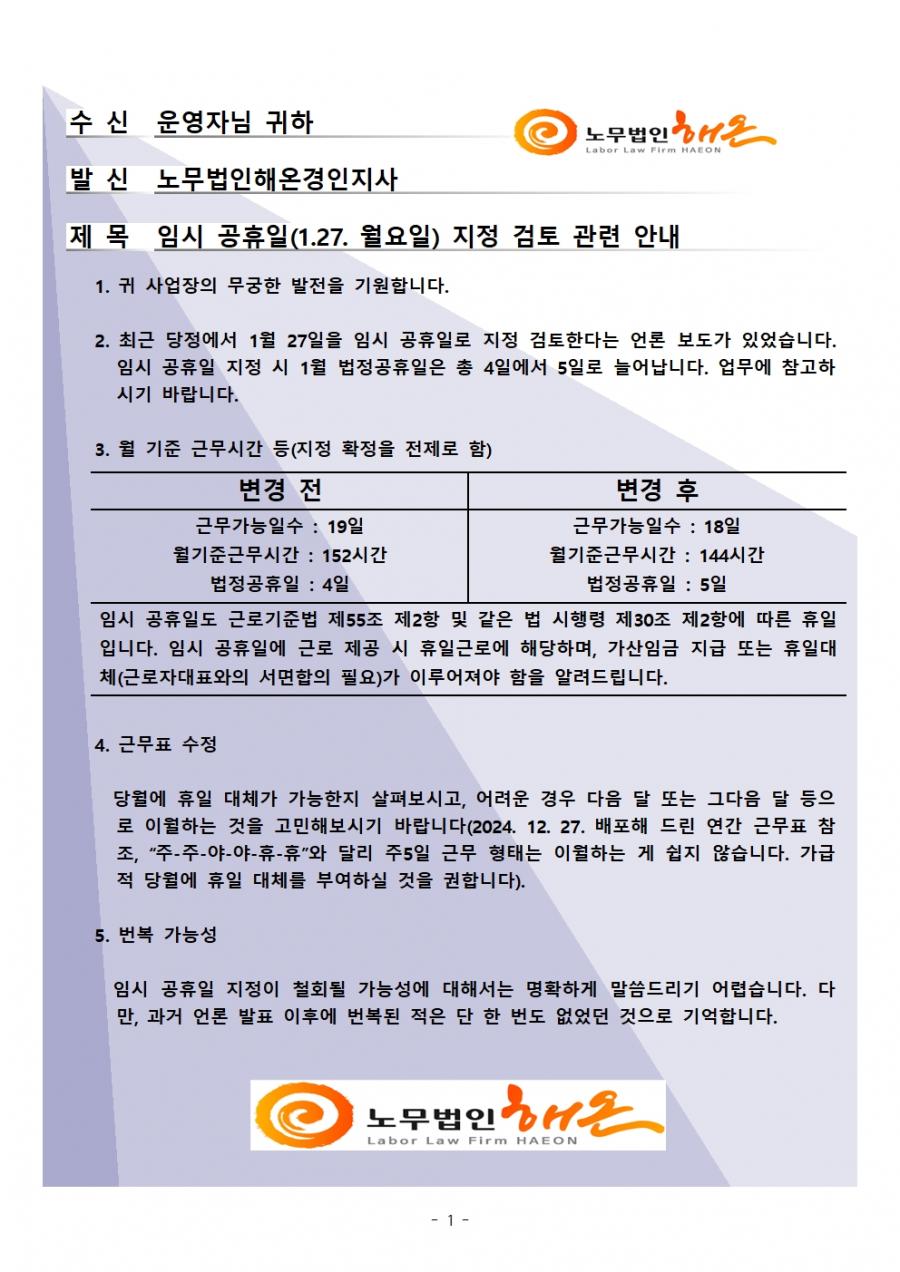 임시 공휴일(1.27. 월요일) 지정 검토 관련 안내