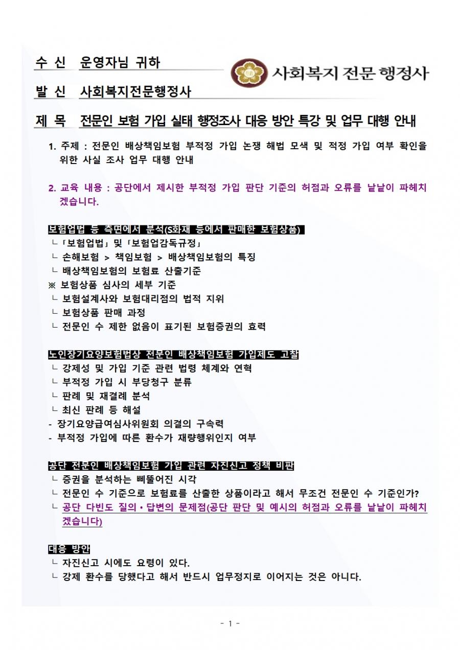 전문인 배상책임보험 가입 실태 행정조사 대응 방안 특강 및 업무 대행 안내