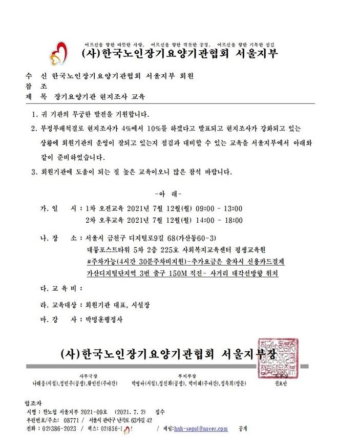 한노협 서울지부 장기요양기관 현지조사 교육 안내