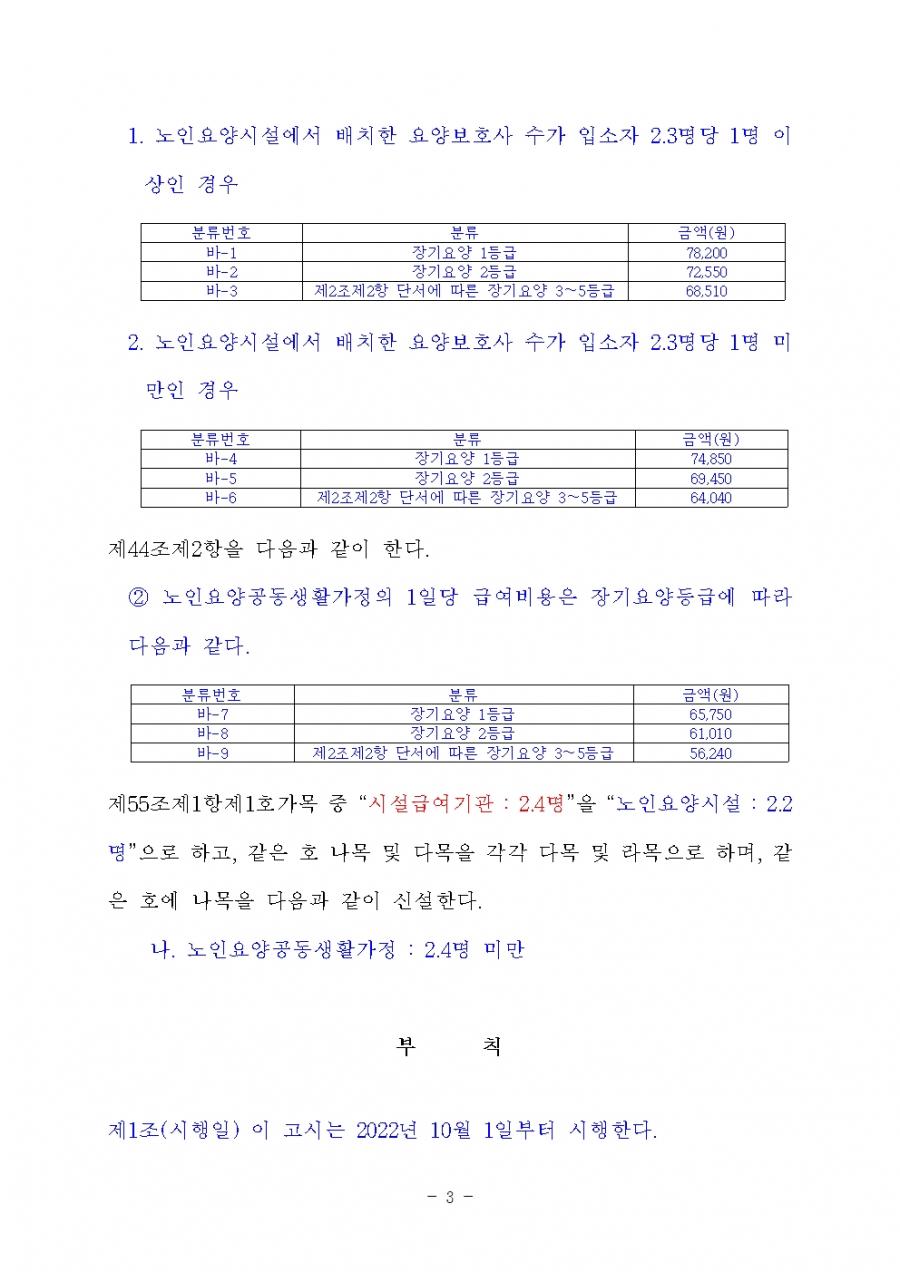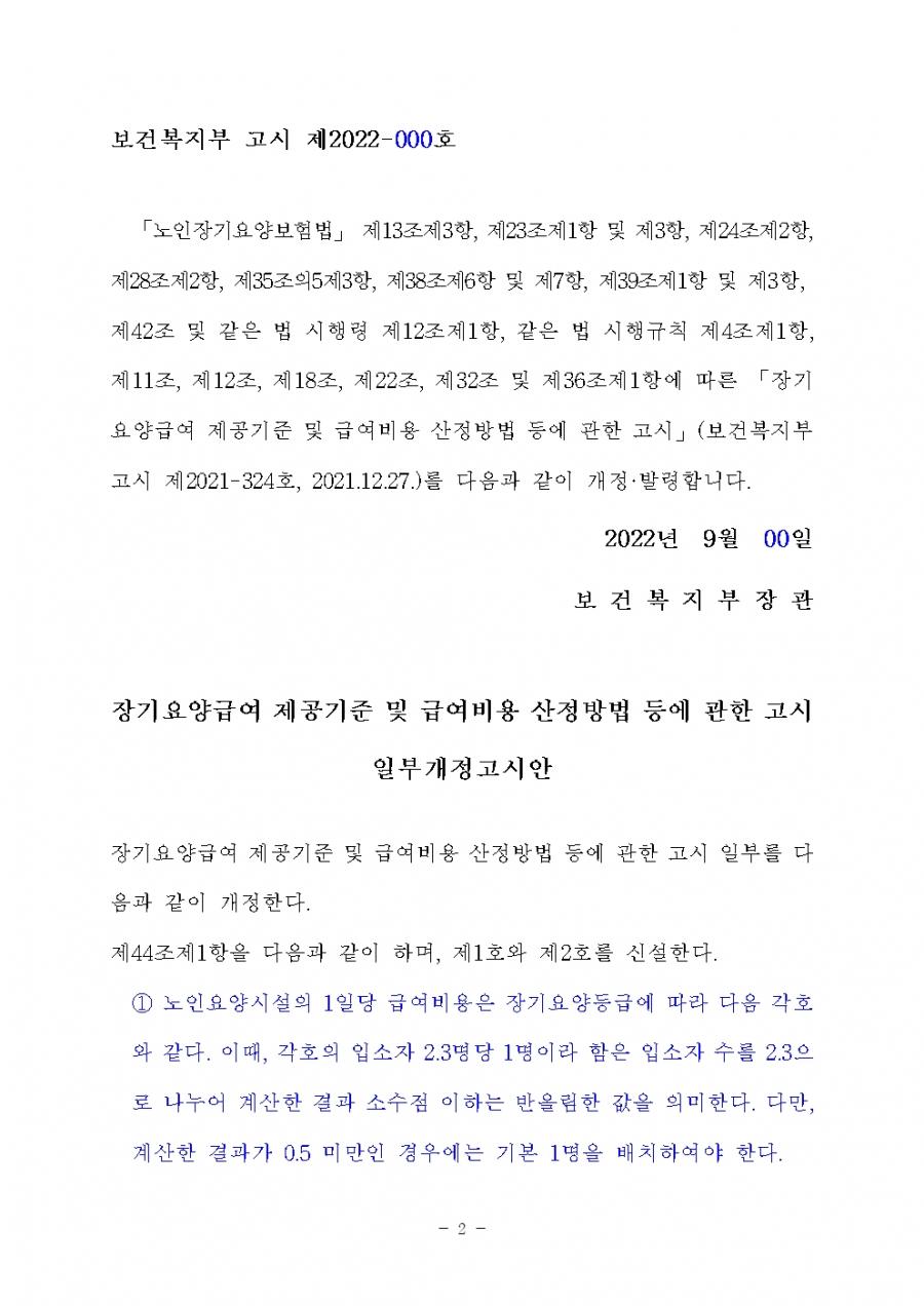 장기요양급여 제공기준 및 급여비용 산정방법 등에 관한 고시 일부개정안 공지해드립니다. 원본은 첨부파일을 확인해주시기 바랍니다.