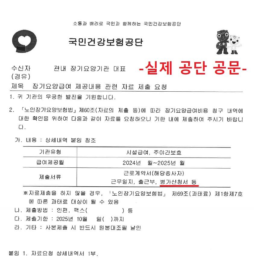 2. 현재(2025년 10월 기준) 국민건강보험공단에서 전국 장기요양기관을 대상으로 유급병가(근무시간 인정 기준 위반 여부) 관련 행정조사(아래 공단 공문 참조)를 진행하고 있습니다.