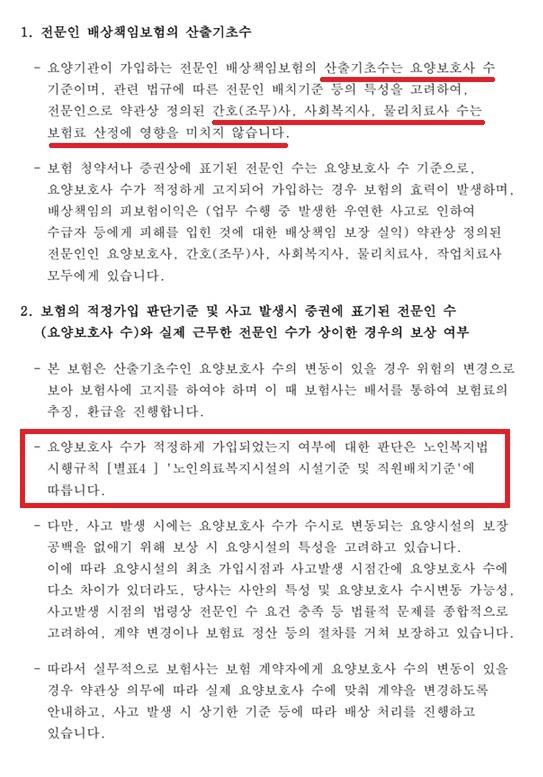그런데 공단은 S화재와 K금융그룹이 판매한 장기보험상품을 전문인 수 기준으로 가입하는 상품이라고 우기면서, 그러니까 증권의 전문인 수(보험료 산출 기초 값)에 일자별 출근하는 전체 피보험자 수(전문인 직종 : 사, 간, 물, 요)가 기재 되어야 한다고 고집하면서 그 숫자만 놓고 부적정가입 여부(위반 여부)를 따지는데, 이는 명백한 사실 왜곡임. 보험설계 측면에서 말하자면, 한마디로 보험료 산출 기초에 요양보호사 수만 입력하는 게 원칙임에도 공단은 일자별로 실제 근무하는 피보험자 수를 전부 입력해야 한다고 왜곡하고 있는 것임.